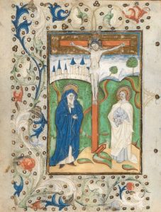 Belle enluminure représentant le Christ, en croix, avec la Vierge Marie à gauche et Saint Jean l'Évangéliste à droite. Paysage en second plan composé de collines arborées et de Jérusalem. Encadrement enluminé de rinceaux fleuris et bezans d'or parsemés