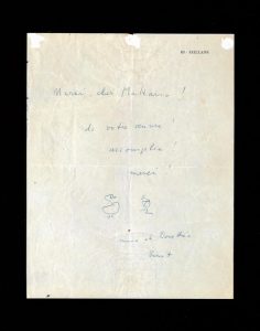 L.A.S. à Makario, illustrée de 2 petits dessins. 1 p. in-4, en-tête «83 - Seillans». Traces de correcteur blanc en haut.