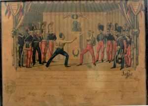 Rare brevet de contre-pointe pour Antoine Joffre, signé par 10 «maitres et professeurs d'escrime». La gravure représente une joute entre deux épéistes, sous l'oeil d'officiers et du buste de Bonaparte.