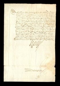 Guerres de religion en Guyenne. «Estant adverti que mes suiets faisant profession de la Religion prétendue réformée ont commencé à prendre les armes en mon pays de Guyenne pour s'opposer à l'exécution et observation du dernier édit que jay faict pour le bien et salut public de mon Royaume, j'ay delibere envoyer aud. pays une bonne et forte armée soubz la charge et conduicte de mon cousin le duc du Mayne assisté de lon cousin le maréchal de Matignon maréchal de France pour me faire obéyr [...]». Il lui demande de réunir ses hommes et de répondre aux ordres qu'il recevra du maréchal de Matignon