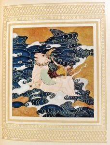 dos fleuronné doré à nerfs, tête dorée, couv. et dos cons. (ombres blanches près du dos du plat sup.). 14 compositions en couleurs hors texte clichées, cernées de grecques et collées sur vélin, protégées de serpentes légendées. Texte cerné d'une frise ocre, couverture illustrée. Tirage à 1.300 exemplaires sur vélin teinté, un des 1.000 du tirage courant (n° 1061).