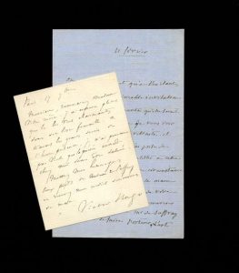 On joint une L.A.S. d'Adèle Hugo, femme de Victor Hugo. S.l.n.d. Elle décline une invitation, vivant dans une retraite totale, et ajoute «[...] l'art dont vous êtes un des plus charmants interprètes unit les coeurs et le mien vous est acquit [...]». Encre brune sur double feuillet de papier vergé bleu