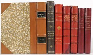 Florilège de la poésie amoureuse du Xu, au xviii, s., illustr. de Sylvain Sauvage. Paris, Le Vasseur, 1948, 2 vol. in-8° demi-chagrin rouge foncé à coins (rel. défraïchie et frottée, ff. brunis, rouss.).— MONT VERT, Maistre Raoul du.- Les Fleurs et secretz de médecine, illustr. de Marie-Ève Mathis. Monaco, Livre d'art, 1949, in-8° demi-percaline brune à coins.— MARIVAUX.- [Oeuvres]. Arlequin poli par l'amour [- La Surprise de l'amour], illustr. de P.-Ém. Bécat. Paris, Arc-en-Ciel, 1952 [- 1953], 2 vol. bradel pleine percaline bordeaux.— ARÉTIN.- Les Ragionamenti, illustr. de P.-Ém. Bécat. S.l., La nef d'argent, 1954, 2 tomes en 1 vol. bradel demi-basane brune à coins.