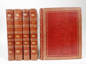 PALLAS: Voyages de M.P.S. Pallas en différentes provinces de l'Empire de Russie et dans l'Asie spetentrionale. Lagrange, 1788. 5 vol. in-4 plein maroquin rouge d'époque, dos à nerfs orné, large dentelle dorée sur les plats, tranches dorées. Bel...