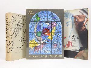 CHAGALL (Marc): réunion de 3 vol. in-4 reliure éditeur: -Vitraux pour Jérusalem, Sauret, 1962, ill. de reproductions et de 2 lithographies originales; -Marc Cjagall Welt, photos Izis, texte Roy Mc Mullen, 1968; -Franz Meyer: Marc Chagall,...