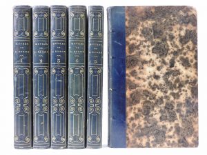 BYRON (Lord): Les Œuvres. Furne, 1830. 6 vol. in-8 demi-veau bleu d'époque, dos lisse orné, tranches marbrées (qq légers frottements, rousseurs) Portrait et planches. Reliure signée Bibolet.