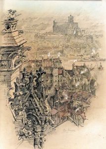 d'édition. Édition originale illustrée de 13 eaux-fortes (10 hors texte, couverture, bandeau et cul- de-lampe). Jouas avait illustré "Le quartier Notre-Dame" de Huysmans en 1905 mais avait continué son travail d'aquafortiste amoureux des vieilles pierres dont les planches sont réunies ici. Elles avaient déjà été montrées à la Galerie Simonson dans le cadre de la "Gravure originale en noir en 1910 et 1913". Illustré (enrichi ?) également du portrait d'Henri Royer gravé à l'eau-forte en frontispice. Tirage à seulement 75 ex. sur vélin de Rives (n° 2). Enrichi de : - 2 dessins originaux : (1). Très belle vue de Paris prise des toits de Notre-Dame, crayon gras noir, crayon sanguine, qqs rehauts de gouache blanche, 28 x 21 cm, signé en bas vers la dr., préparatoire au hors-texte de la p. 33.— (2). Colonnade gothique, crayon gras noir et crayon sanguine, 27,5 x 19,5 cm.