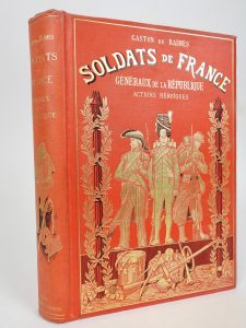 RAIMES (Gaston de): Soldats de France; Généraux de la République. Lemerre, sans date. Grand in-8 toile éditeur, premier plat orné d'un décor personnalisé or et noir, tranches dorées. Illustrations de Henri Pille. Bel exemplaire.