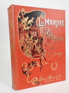 CONTESSE (G.): La Marine d'Autrefois. Tours, Mame et Fils, 1897. Grand in-8 toile éditeur, premier plat orné d'un décor personnalisé or et noir, tranches dorées. (légères rousseurs). Ouvrage orné de 80 gravures.