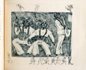 géométrique en cuirs gris et rouge, tête dorée, couv. et dos cons. Édition originale illustrée de 20 eaux-fortes hors texte tirées en sanguine avec remarques (sauf 3 en bleu) : scènes de lupanars pour la plupart, scènes de bal musette ou d'orchestre de jazz. Tirage à 550 ex., un des 450 ordinaires (n° 214).