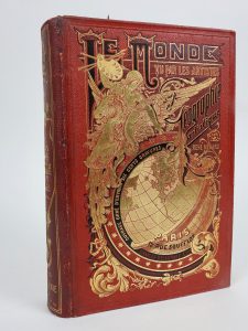 MENARD (R.): Le tour du Monde vu par les artistes. Géographe artistique. Delagrave, 1881. Grand in-8 demi-chagrin rouge éditeur, premier plat orné d'un grand décor personnalisé or et noir, tranches dorées. Ouvrage illustré d'enviorn 600...