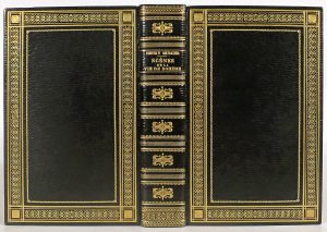 palmettes, filets et fleurons dorés, dos à nerfs ornés de multiples filets et entre-nerfs à fleurons romantiques dorés, doublures de soie moirée rose vif sertie de cadres, filets dorés et même maroq., gardes volantes de même soie, doubles gardes de papier marbré, tranches dorées, couv. et dos cons. Sous étui bordé. Illustré de 60 compositions mises en couleurs au pochoir (couverture, bandeaux, in texto et vignettes diverses) et du fac-similé d'une lettre cosignée par Murger. Tirage à 500 ex., un des 50 de tête sur vélin de Rives (n° 5) accompagnés de : - 1 aquarelle originale signée, préparatoire au bandeau de la p. 52 mais dont le sujet est un peu différent, - 1 suite en noir de toutes les compositions sur Chine. • Reliure d'inspiration Empire. aquarelle originale