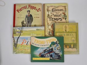 Réunion de 5 albums: The Little river, ill. de Rand et Feodor Rojankovsky, toile bleue éd., jaquette; -Girardin: Nous deux, Hachette et Cie, 1881. Illustrations de Sowerby et Emmerson; -Tschu-Tschu die Kleine Lokomotive. Livre a système, dos à...