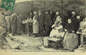 Paris 12 cpa représentant des scènes de marchés dont marchandes d’Arlequins, de soupe, compteurs mireurs