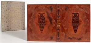 composition gaufrée à froid sur les plats avec arabesques, pointillés et grande urne centrale, dos à deux nerfs et entre-nerfs ornés comme les plats, tête dorée, couv. et dos cons. Texte imprimé en italiques illustre de 82 compositions mises en couleurs au pochoir (44 bandeaux et 38 culs-de-lampe). Tirage à 550 ex., un des 500 sur vélin blanc (n° 155). Joint : OVIDE.- Lettres amoureuses. Les Héroïdes, trad. de Miroux, illustrations de Manuel Orazi gravées sur bois par Perrichon. Paris, Kieffer, 1919, relié par Kieffer en pleine peau à impression serpent, plat sup. titré doré, dos à nerfs, tête dorée, couv. et dos cons. (dos passé). Illustré de 21 compositions tirées en camaïeu, chaque page ornée de cadres et vignettes. Tirage à 250 ex., un des 180 sur papier vélin (n° 171).