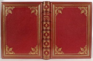 filets dorés et de grands fleurons dorés dans les angles, dos à nerfs et caissons ornés comme les plats, double filet doré sur les coupes, doublures de reps moiré bordeaux cerné de maroq. rouge, filets et roul. pointillée dorés avec fleurons d'angles et listel de maroq. brun foncé sur les coupes et remplis, gardes de même reps, doubles gardes de papier marbré, tranches dorées, couv. et dos cons. Sous chemise en demi-maroquin rouge à bandes doublée de fine peau naturelle. Sous étui bordé. Illustré de 45 dessins fin-de-siècle en noir imprimés par Vigneron et dont les planches ont été détruites après tirage : 12 hors- texte, 13 bandeaux, 13 culs-de-lampe, 5 grands culispices et 2 in texto. Exemplaire de l'artiste avec note signée par Léon CarteretT sur la garde blanche "Trois états, trois originaux de William Fell - Riche reliure. édition rare la moitié du tirage ayant été détruite". Tirage à seulement 110 ex. sur Whatman, exemplaire de chapelle "de l'artiste W.F.". Il n'a été tiré que 11 suites à part dont 1 sur Whatman et 10 sur Japon ancien. Tirage à seulement 110 ex. num. sur whatman, un des 100 mis dans le commerce (n° 22). Enrichi de : - 1 dessin original, signé, à la mine de graphite et rehauts de sanguine et ocre : scène galante de style XVIII, s. au pied d’un arbre, - 1 dessin original, signé, à la mine de graphite : femme de profil se déshabillant, - le dessin original du frontispice, signé et daté 1919, - 2 suites des hors-texte en et 2, états, sur Whatman (sauf ceux des pp. 20 et 40 en 1 état), - 1 état supplémentaire du frontispice avant la lettre et du hors-texte de la p. 36, - 1 état supplémentaire (refusé ?) du cul-de-lampe de la p. 6, - 1 essai refusé du titre et du colophon, - 1 essai de tirage de la couv. (la couv. d'édition est tirée sur Japon).