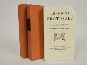 BERANGER: Chansons érotiques. Crès et Cie, 1924. In-12 broché, étui. Edition illustrée par Joseph Hémard. Tirage à 550 ex., celui-ci 1/275 Pur Fil.