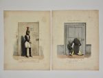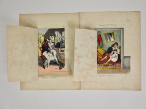 ANONYME: Réunion de 4 rares lithographies en couleurs à Systèmes du XIXe siècle présentant des scènes très libres, dans le goût d'Achille Dévéria. Format 31 x 25 cm. MAGNIFIQUES ET TRÈS RARES PLANCHES ÉROTIQUES À SYSTÈME, peut-être...