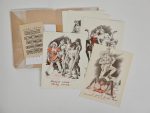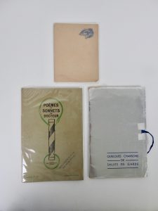 PLAQUETTES: Réunion de 3 plaquettes -Quelques chansos de Salles de Garde, 1930, tirage à 200 ex. ; -Poèmes et sonnets du docteur, fascicule n°III, ill. de Tuchet; Plaquette regrouppant 8 images pornographiques imprimées en rose et gris, vers 1945.