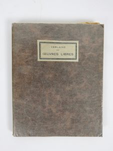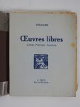 VERLAINE (P.): Œuvres libres. A Paris pour les Bibliophiles, sans date. In-12 carré en ff. sous couv. (qq rousseurs). Titre orné d'une belle vignette gravée sur bois. Bien complet de la planche hors texte qui manque souvent. Tirage limité à 500...