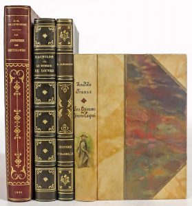 4 ouvrages dont un d'Anatole France en demi-reliure peinte. FRANCE, A.- Les opinions de M. Jéröme Coignard recueillies par Jacques Tournebroche. P., Calmann-Lévy, s.d., in-8° bradel demi-vélin, dos lisse titré à la plume avec motif peint...