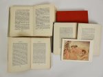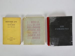 DIVERS: 3 vol. in-12 brochés: -Pauline Réage: Histoire d'O. Sceaux, Pauvett, 1954. 1/1000 vergé; -Apollinaire: les onze mille verges…Menton-Garavan, 1932; -Les curiosités. , 8 planches libres en couleurs.