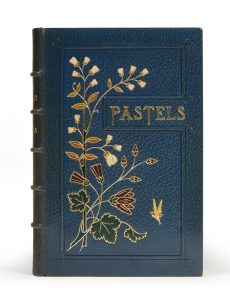 BOURGET (Paul). — Pastels. — Dix portraits de femmes. — Paris, Librairie L. Conquet, 1895. — Grand in-8°, maroquin bleu, titre doré et large décor végétal et animal doré et mosaïqué ornant le premier plat, dos à nerfs, doublure et...