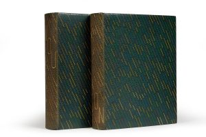 BROMFIELD (Louis). — La Mousson. — Paris, Les Heures claires, 1947. — 2 volumes in-4°, maroquin vert, plats et dos lisse entièrement ornés d’un décor de filets obliques dorés et polychromes interrompus figurant la pluie, titre doré...