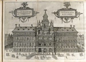 à couture apparente, dos lisse titré à la plume, tr. jaspées (vélin du plat inf. rapé, notice de catalogue collée au contreplat sup., notes mss en néerlandais sur la garde sup.). Édition originale et unique illustrée de 7 grandes planches figurant le plan de la ville et de la citadelle du duc d'Albe, la carte du diocèse, des vues de la cathédrale, de l'hotel de ville, de la bourse et de la Maison hanséatique, toutes extraites de l'ouvrage de Guicciardin mais retouchées par Théodore Galle. Dédicace et 6 pièces de vers en grec et en hébreu. Relié avec, comme il se doit (ens. 2 ouvr. en 1 vol.), mêmes auteur, éditeur et date : Origines Antverpiensium. 172-[3] pp. Réunion de deux ouvrages consacrés à l'histoire d'Anvers dus au jésuite Charles Scribani (Bruxelles 1561-1629 Anvers), élève de Lessius à Louvain, professeur de rhétorique et de philosophie, grand administrateur de son ordre (e.a. recteur des collèges d'Anvers et de Bruxelles et provincial de Flandre) et auteur fécond, neveu du 2d évêque d'Anvers Laevinus Torrentius ou Lieven van der Beken. # De Backer-Sommervogel VII-984; # Biogr. nat. XXII-116/129.
