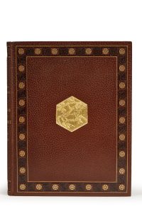 dorées ornant les plats, motif hexagonal en relief doré incrusté au centre (différent sur les deux), dos lisse orné, tranches dorées, doublure et gardes de moire beige, doubles gardes, couverture à décor gaufré conservée, étui (Jules Chadel - Georges Cretté).
