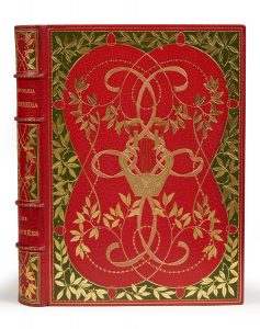 maroquin brun entièrement ornée d’un décor également doré et mosaïqué au Pégase, gardes de soie rouge, doubles gardes, couverture de vélin ivoire à ornementation dorée, chemise en demi-maroquin rouge à petits recouvrements et étui (J. Chadel. del. & Joly rel. 1919).