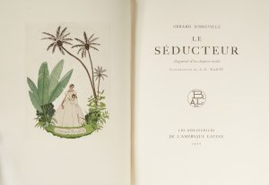 HOUVILLE (Gérard d’). — Le Séducteur. — S. l. [Paris], Les Bibliophiles de l’Amérique latine, 1926/1927. — In-4°, maroquin vert clair, large décor de filets dorés ornant les plats, irradiant à partir de coins de vélin ivoire bordés...