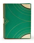de listels mosaïqués, dos lisse orné de filets losangés dorés mordant sur les plats, pièce de titre de vélin ivoire encadrée d’un listel mosaïqué au centre, tranches dorées, doublure de vélin ivoire, gardes de moire verte, doubles gardes, couverture conservée, chemise en demi-maroquin vert à petits recouvrements et étui (Zipélius Brillouin).