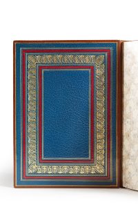même motif, tranches dorées, doublure de maroquin bleu nuit ornée d’un large décor d’encadrement doré et mosaïqué, gardes de soie beige brodée, doubles gardes, couverture illustrée conservée et étui (E. Carayon).