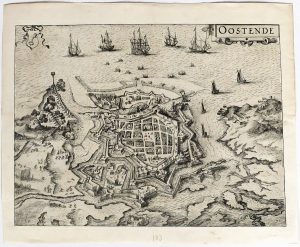 (Flandres, Carto-topographie) — 1 zicht van Nieuwpoort (Visscher uit "Theatrum praecipuarum Urbium Ducatus Brabantiae") en 3 plattegronden van Oostende, 17de eeuw. Kopergravures, gevariëerde formaten van 16,5 x 19 cm tot 21,5 x 34 cm.