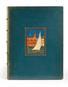 MUSSET (Alfred de). — Venise. — Paris, Chez Henri Le Riche, 1928. — Grand in-4°, maroquin bleu, décor doré et mosaïqué personnalisé au centre du premier plat, dos à nerfs, tête dorée, doublure et gardes de soie brodée à semis de...