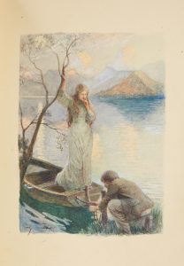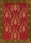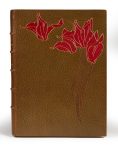 nerfs, tranches dorées, doublure de maroquin rouge entièrement orné d’un autre décor floral doré et mosaïqué, gardes de soie taupe, doubles gardes, couverture illustrée en couleurs conservée, chemise en demi-maroquin brun à petits recouvrements et étui (René Kieffer).