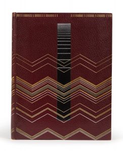 ornés d’un décor doré et mosaïqué, tranches dorées, doublure et gardes de chamois gris-souris, doubles gardes de papier doré, couverture conservée, chemise et étui (Pierre Legrain).