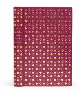 VERLAINE (Paul). — Fêtes galantes. — A Paris, s. d. [1942]. — In-8°, veau violet, plats et dos entièrement ornés d’un décor de pastilles dorées pleines ou évidées en alternance, tranches dorées, doublure et gardes de soie verte,...
