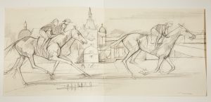 formé de têtes de chevaux entremêlés au centre, dos lisse orné des mêmes filets, doublure et gardes de chamois brun-rouge, tranches dorées, couvertures conservées, chemises en demi-maroquin à petits recouvrements et étuis (Georges Cretté).