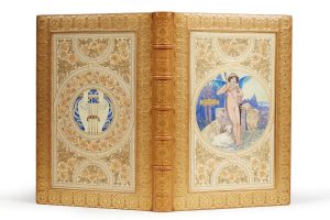 VIRGILE. — Les Eglogues. — Préface par Émile Gebhart. — Paris, Plon, Nourrit & Cie, Éditeurs, 1906. — Grand in-4°, maroquin beige, plats ornés d’une dentelle dorée encadrant de larges décors peints insérés, dos à nerfs orné du...