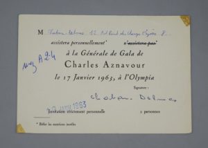 Invitation à la Générale du Gala de Charles Aznavour, le 17 janvier 1963 à l'Olympia. Chaban-Delmas l'a signée, indiquant qu'il y assistera personnellement.