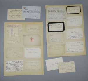 Zacharie ASTRUC, Ian Van BEERS, Jean BENNER, BERTHELIER, Baron BEYENS, Pierre-Marie BEYLE, Léon BIENVENU, William BOUGUEREAU, Jacques BOUHY, Paul BOURGET, Albert BRASSEUR, CHAM, Georges CLAIRIN, Jules CLARETIE, Léon COMERRE, Henri COOPER, François COPPÉE , Édouard DANTAN, Paul DÉROULÉDE, Émile DESCHANEL, Edouard DETAILLE, Auguste FEYEN-PERRIN, Émile FRIANT, Edmond GONDINET, Philippe GILLES, Paul GINISTY (2), Edmond de GONCOURT, Alfred GRÉVIN, Albert GUILLAUME, Ludovic HALÉVY (2), Marcel HANOTEAU, Henri HARPIGNIES, JUDIC, Léon LHERMITTE, Luigi MANZOTTI, Jules MASSENET, Henry MEILHAC, Aimé MILLET, Hector MONRÉAL, Alphonse de NEUVILLE, Walthère Frère dit Frère ORBAN, Aimé PERRET, REICHENBERG, Fernand RENARD fils de Draner, Albert ROBIDA (2), ROLLE, SCHENCK, Paul SINIBALDI, Francis TATTEGRAIN, Général TOURNIER, Albin VALABRÈGUE, Louis VARNEY, Eugène VIVIER, Albert WOLFF, + 6 autres cartes.