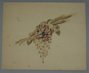 Très bel ensemble de cinq dessins à la gouache, représentant des diadèmes et autres coiffes de pierres précieuses. Les détails et les couleurs sont d'une grande finesse. Numérotées de 1 à 5.