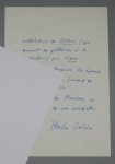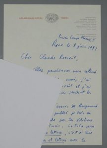 CALVINO, Italo. L.A.S. à Claude Rameil, ami de Boris Vian et Queneau. Rome, 8 juin 1981. 2 pp. in-8. En-tête des Éditions Giulio Einaudi, à Turin. Avec enveloppe.