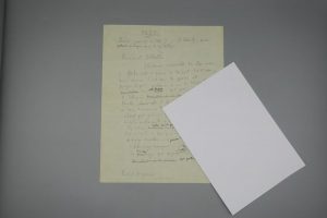 Intéressantes notes sur le théâtre, ses pièces et Shakespeare. " Parade (renvoyer au coq) - Le Boeuf - avec prologue lu à la représentation ". Considérations sur Roméo et Juliette, qu'il adapta librement en 1918 et fit représenter en 1924 aux Soirées de Paris du comte de Beaumont. " Certaines merveilles de la mer se flétrissent à peine on les sort de l'eau []. De la poésie de Shakespeare il ne reste alors que fluettes et clair de lune []. Mais si bien des poètes d'Angleterre n'existent que par ces reflets, Shakespeare possède en outre une charpente qu'il est souvent difficile d'apercevoir chez nous cachée sous des guirlandes de fleurs mortes. C'est la charpente que je montre [] ". Puis au verso : " Les Mariés de la tour Eiffel (préface) ".