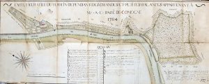 à l'aquarelle (collé sur toile, plié, faiblement défraïchi sur les bords). Grand plan du domaine avec maison, cours et terrasses, jardins et "jardin d'eau", potagers, vergers, prairies, bois etc. sur la rive droite de la Sambre, traversé par le chemin de Namur aux villages de Malonne et de Floreffe. Plan de géomètre à l'"échelle de 16 pieds et 1/2 de Namur dit de St Lambert, pour la verge", avec rose des vents et grande légende.