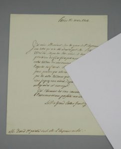 Copie du tableau du Sacre de Napoléon. " J'ai mis, Monsieur, sous les yeux de l'Empereur une lettre qui m'a été adressée par M. Peter Whiteside, citoyen des Etats-Unis. Il demande la permission de faire faire par vous une copie de votre tableau du couronnement et de pouvoir l'exporter de France. Sa Majesté ne s'y oppose pas, pourvu que cela ne dérange et ne retarde pas les autres tableaux que vous êtes chargé de faire. Vous jugerez vous même, d'après cela, si vous pouvez entreprendre cet ouvrage [] ".