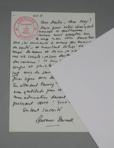 DURRELL, Lawrence (1912-1990), écrivain britannique. L.A.S. au peintre Michel Moy (1932-2007). S.d. " 15 octobre ". 1 p. in-8. Cachet rouge à son nom et adresse.