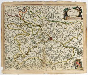 (Namur, Carto-topographie) - Ens. de 7 pièces - 7 pièces : 2 cartes du comté (par Kaerius et Visscher), 4 vues de ville (Guicciardin, Meisner de "Sciographia cosmica", Merian...) et 1 plan de bataille par de Beaurain, 17e-18e siècles. Gravures...